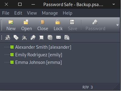 Opening the file with the cracked password gives passwords for alexander,emily and emma.