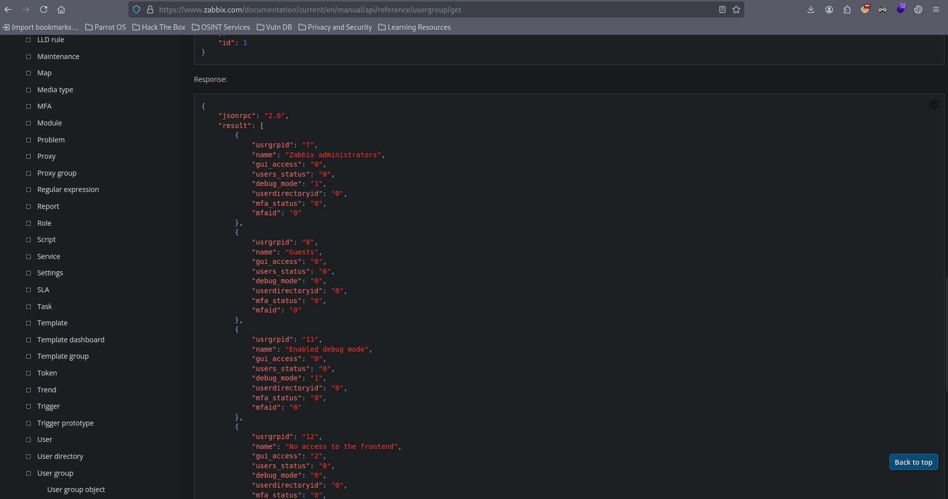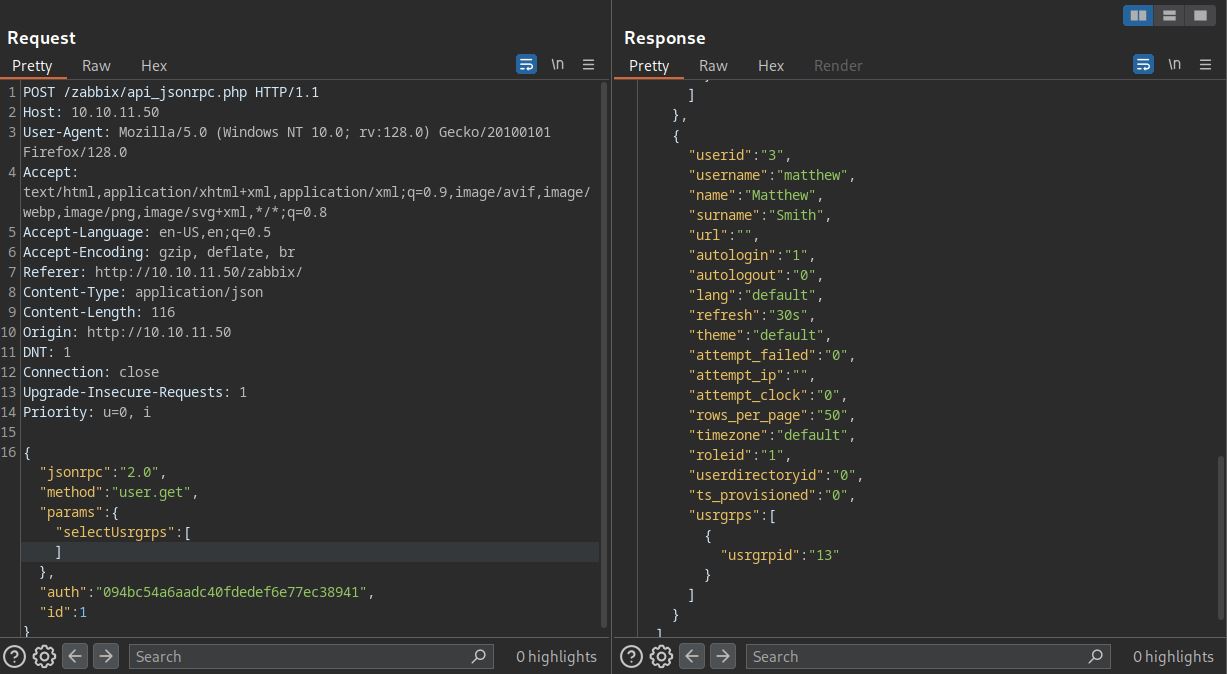 Successfully got a API token. Before we try user.update to update our roles, let’s try to find our userid. Bruteforcing the userids also work but we can see every user id using user.get function. Using the selectRole or SelectUsrgrps as params returns the userlist and scrolling down, we can see matthew user as userid:3.